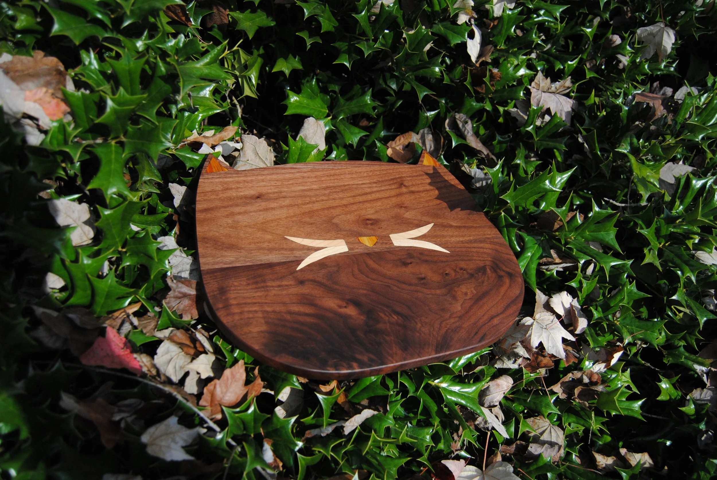 Cat shaped cutting board featuring contrasting inlay whiskers and ears.